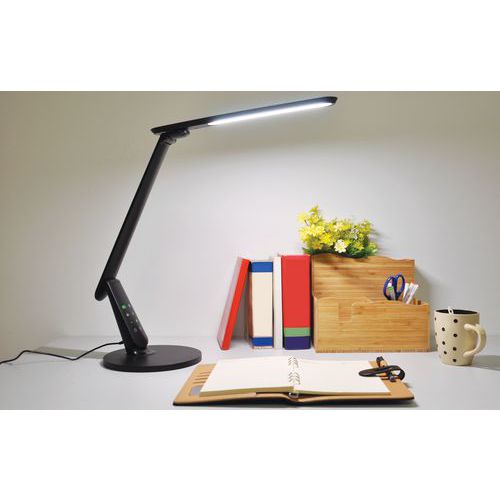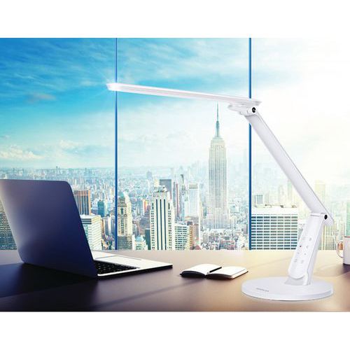 Lampe de bureau avec tête inclinable d'avant en arrière. Bras avec une articulation pour facilité l'orientation de la diffusion de la lumière. Ergonomie et multiples fonctionnalités. 5 axes d'orientation possibles pour le bras et le reflecteur. Panneau sensitif de contrôle des fonctions. 4 ambiances de lumière. Fonction Timer. Port USB. Idéal pour le télétravail.