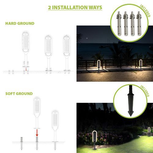 2 modes de fixation : soit avec des vis soit avec un piquet (tous deux fournis).