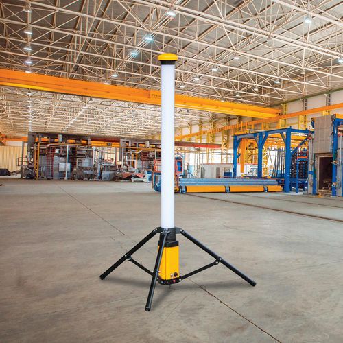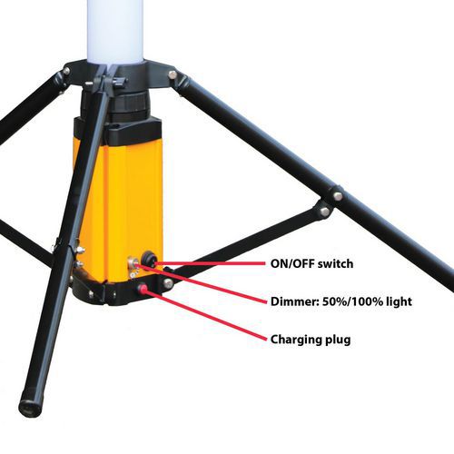 Géant : avec 159 cm de hauteur, 85 cm de base, la lampe LED trépied rechargeable se démarque définitivement sur le chantier ,.