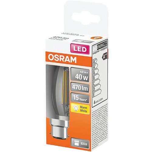 | Intitulé du produit | Led Fla Clair Fila.4W B22 Chd Bte, Flux lumineux: 470 lm, Type de culot: B22 |