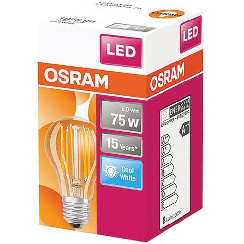 | Intitulé du produit | Led Std Clair Fila.7W E27 Frd Bt1, Flux lumineux: 806 lm, Type de culot: E27 |