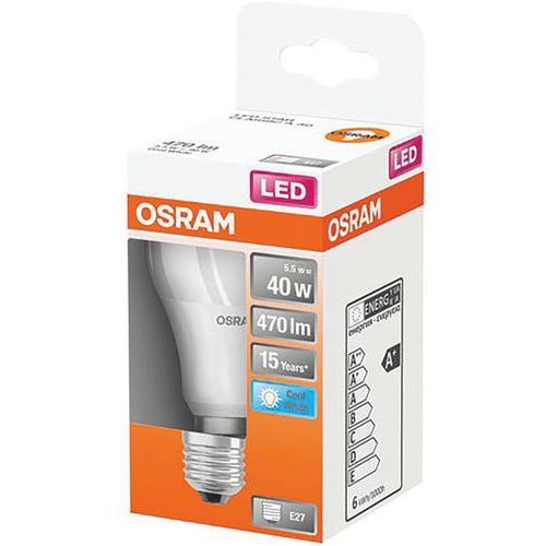 | Intitulé du produit | Led Std Dep.A/Radia.5.5W E27 Frd Bte, Flux lumineux: 470 lm, Type de culot: E27, Nb d'ampoules: 1 |