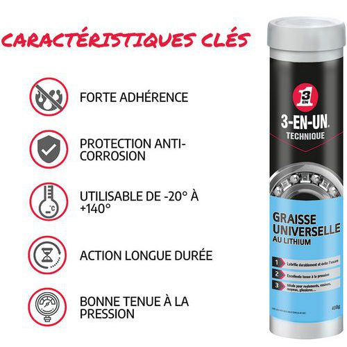 - Graisse universelle au lithium épaisse procurant une lubrification résistante à l’eau et à la chaleur.