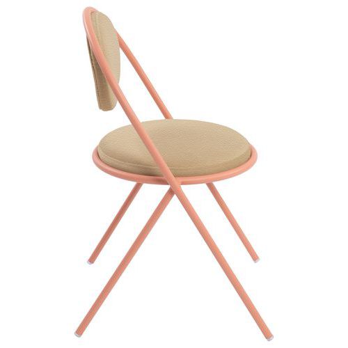 Design contemporain Seconde Vie : Possibilité de changer assise et dossier pour une durée de vie infinie, non déhoussable Empilable Structure: tube Ø20 mm en acier 100% recyclé, finition époxy Assise: panneau contreplaqué, épaisseur 12 mm Garniture: mousse polyuréthane 30 kg/m3, épaisseur 30 mm
