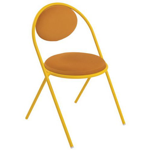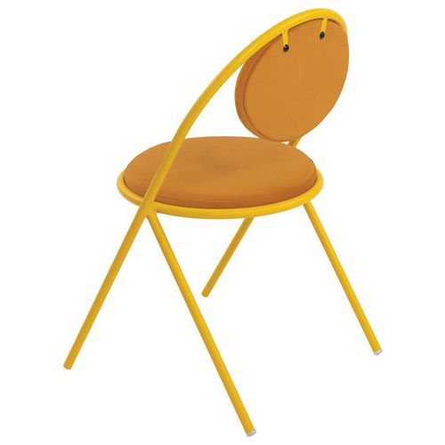 Design contemporain Seconde Vie : Possibilité de changer assise et dossier pour une durée de vie infinie, non déhoussable Empilable Structure: tube Ø20 mm en acier 100% recyclé, finition époxy Assise: panneau contreplaqué, épaisseur 12 mm Garniture: mousse polyuréthane 30 kg/m3, épaisseur 30 mm