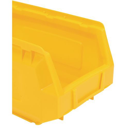 Rebords avec plots de blocage pour stabilité au gerbage. Grande robustesse grâce à ses nervures latérales. Fond plat et antidérapant pour une prise facile. Excellente prise en main par poignée avant. Bac plastique haute résistance aux chocs. Identification facile via porte-étiquette.