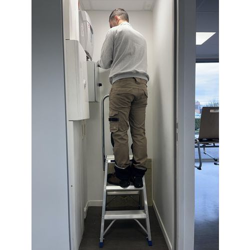 Marchepied double plans de montée en aluminium muni d'un système anti-écartement faisant office de repose...