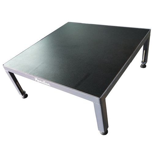 Marchepied-plateforme acier moyenne hauteur. Pieds filetés pour réglage à hauteur souhaitée. Position en hauteur fixée par contre-écrous. Plateau bois à revêtement antidérapant.