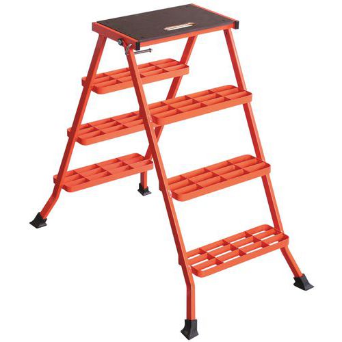 LES PLUS : Facilement repliable et transportable grâce à la poignée de transport. Usage professionnel grâce aux marches caillebotis de 400 x 130 x 25 mm (confort de travail). Patins antidérapants. Plateforme supérieure en contreplaqué antidérapant 250 x 390 x 9 mm. Conforme à la norme EN 131.