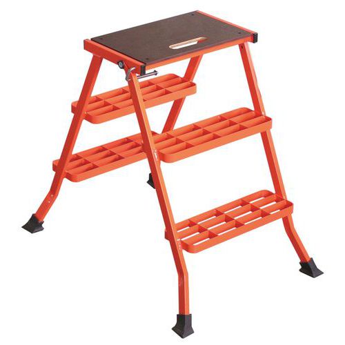 LES PLUS : Facilement repliable et transportable grâce à la poignée de transport. Usage professionnel grâce aux marches caillebotis de 400 x 130 x 25 mm (confort de travail). Patins antidérapants. Plateforme supérieure en contreplaqué antidérapant 250 x 390 x 9 mm. Conforme à la norme EN 131.