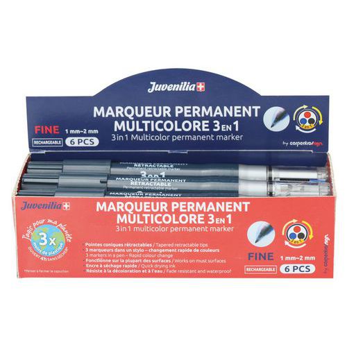 | Intitulé du produit | Marqueur permanent 3 couleurs pointe rechargeable, Encre coloris: Assorti, Corps matériau: PVC |