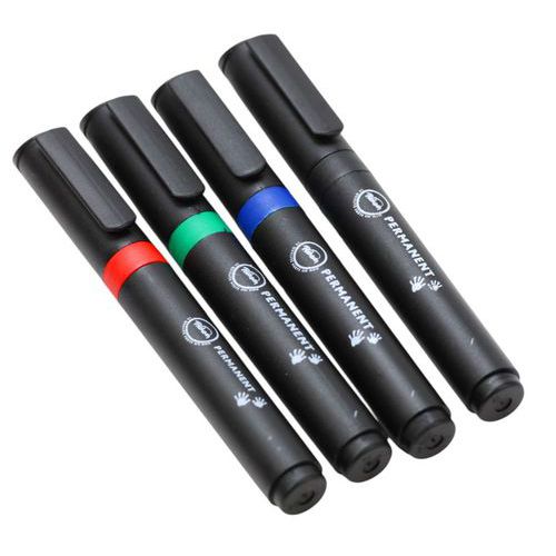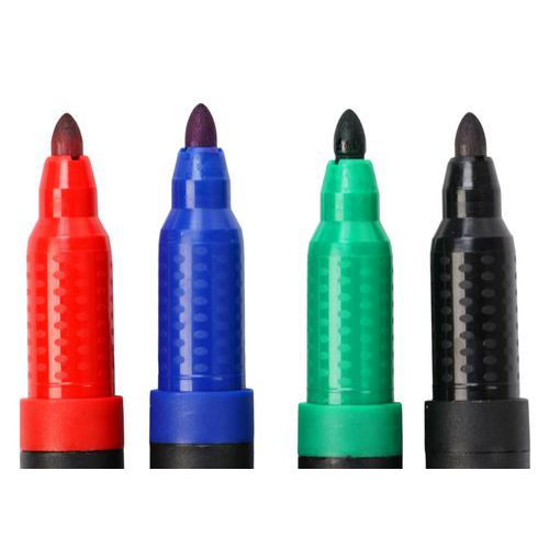 Marqueur permanent avec encre indélébile, adapté pour différents supports. Pointe ogive assurant un trait régulier de 4 mm de largeur. Équipé d’un corps en plastique et d’un bouchon conçu pour préserver l’encre. Produit fabriqué à 72 % à partir de briques d’emballage alimentaire recyclées. Proposé en quatre coloris : bleu, noir, rouge et vert.