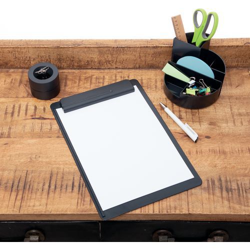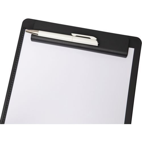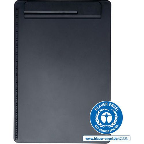 Porte-bloc A4 go Recyclage 90 % plastique PS recyclé portrait : constitué de plus de 85 % de plastique recyclé (matériau post-consommation). Confortable : bordure sur le côté gauche, porte-stylo intégré dans la pince. Solide : pince large en matière plastique avec puissants ressorts métalliques. Ouverture de la pince environ 0,8 cm.