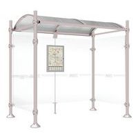 Abri bus Province avec poteaux ronds Ø 76 mm, sur platines, pommeau Agora. Tubes aluminium épaisseur 3 mm. Toiture : voûte en polycarbonate alvéolaire 6 mm traité anti-UV, cadre avec 2 traverses en tube aluminium 40 x 60 mm et 2 gouttières en profilé aluminium. Bardage de fond et latéraux en verre sécurisé 8 mm. Vitrine horaire 750 x 550 mm (4 A4), épaisseur 30 mm en aluminium anodisé Arceaux en profilé aluminium cintré. Embases et colliers en aluminium moulé. Vitrine horaire : porte battante remplaçable et réversible. Vitrage plexichocs, ép. 4 mm. Serrure de sécurité 2 clés. Joint d’étanchéité élastomère. Fond tôle galvanisée, laqué blanc. Pose sur platines. Fixation fournie