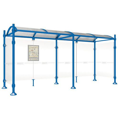 Abri bus Province avec poteaux ronds Ø 76 mm, sur platines, pommeau inox brossé. Tubes aluminium épaisseur 3 mm. Toiture : voûte en polycarbonate alvéolaire 6 mm traité anti-UV, cadre avec 2 traverses en tube aluminium 40 x 60 mm et 2 gouttières en profilé aluminium. Bardage de fond et latéraux en verre sécurisé 8 mm. Vitrine horaire 750 x 550 mm (4 A4), épaisseur 30 mm en aluminium anodisé Arceaux en profilé aluminium cintré. Embases et colliers en aluminium moulé. Vitrine horaire : porte battante remplaçable et réversible. Vitrage plexichocs, ép. 4 mm. Serrure de sécurité 2 clés. Joint d’étanchéité élastomère. Fond tôle galvanisée, laqué blanc. Pose sur platines. Fixation fournie Garantie client : 5 ans