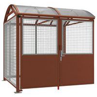 Abri vélos et motos Voûte L complémentaire avec poteaux en acier 80 x 80 mm. Toiture : traverses en acier 60 x 40 mm et gouttières en aluminium, renforts anti-effraction. Voûte en polycarbonate alvéolaire épaisseur 10 mm, anti-UV. Bardages de fond et latéraux : grillage rectangulaire en fil de Ø 5 mm soudé sur un cadre en cornière acier. Fixation sur platines, pieds réglables en hauteur, chevilles à expansion fournies Finition peint sur galva. Grillage galva. Fermeture par digicode. Sécurisation de la double porte : partie haute en grillage carré fil de Ø 5 mm, partie basse en tôle épaisseur 1,5 mm. Déverrouillage par digicode mécanique. Ouverture des portes de l’intérieur sans clés. Maintien des portes en position ouverte et fermée par loquets et sabots