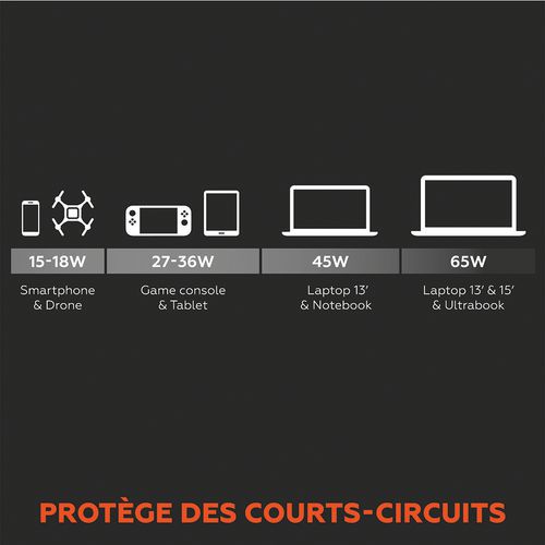 - Puissance rapide et fiable fournissant jusqu’à 65 W