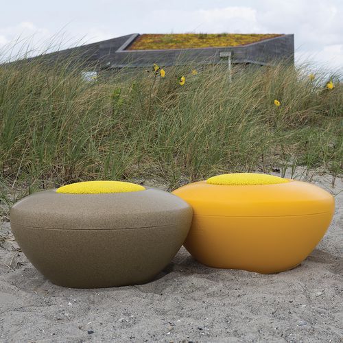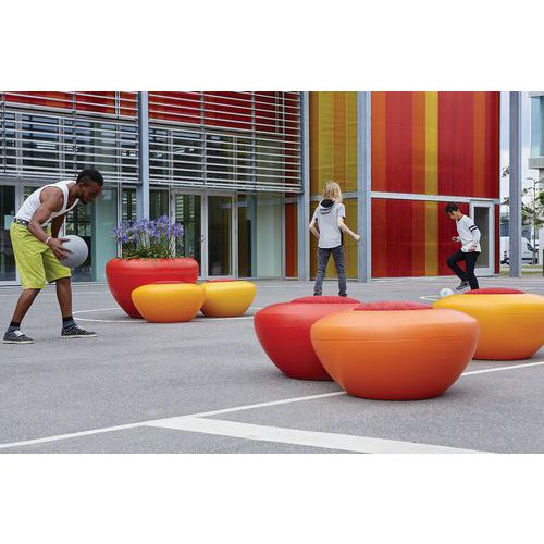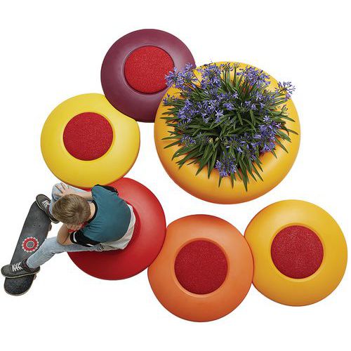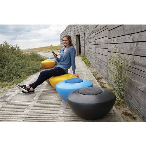 Assise Scoopi modulable Formes douces et arrondies Convient parfaitement pour les parcs et aires de jeux La partie extérieure de l’assise est fabriquée à partir de polyéthylène moulé par rotation (plastique). Le plastique est résistant aux UV et supporte des températures allant de -30 à +50 °C (pas au-dessus de 60).