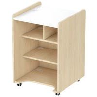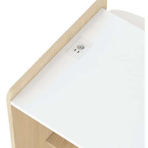 La banque d'accueil mobile Eden permet de créer un espace de réception en quelques instants. Panneau de particules agglomérées haute densité (680 kg/m3) et classé non feu catégorie M3 revêtu de mélaminé épaisseur 25 mm. Boitier connecté coloris blanc ou Anthracite/aluminium, 1 prise courant + 1 USB chargeur A 5w + 1 USB chargeur C 15w Obturateurs aluminium perçage Ø 80 mm sur les étagères permettent le passage des câbles du boitier connecté 4 roulettes à frein en polyamide diamètre de roue 60 mm, largeur 53 mm