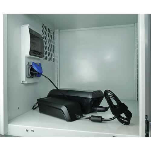 Équipement par casier : 2 prises 220 volts avec cache, 1 disjoncteur différentiel et 1 disjoncteur.