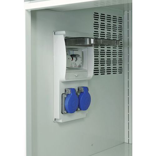 Équipement par casier : 2 prises 220 volts avec cache, 1 disjoncteur différentiel et 1 disjoncteur.