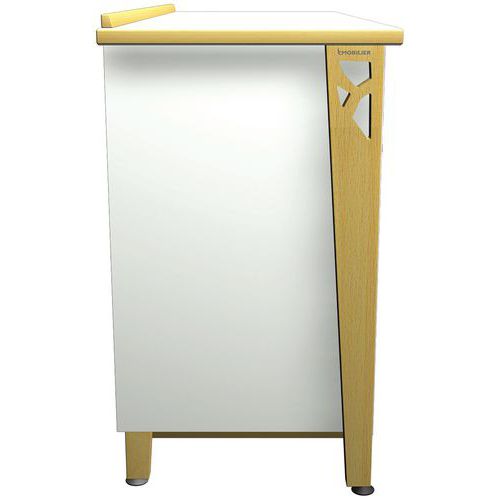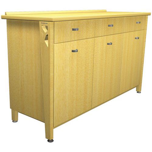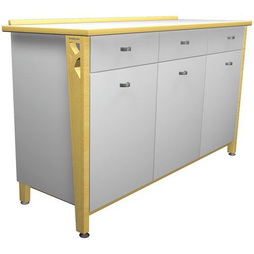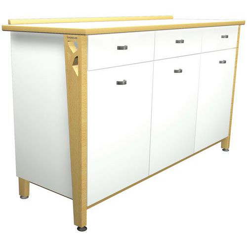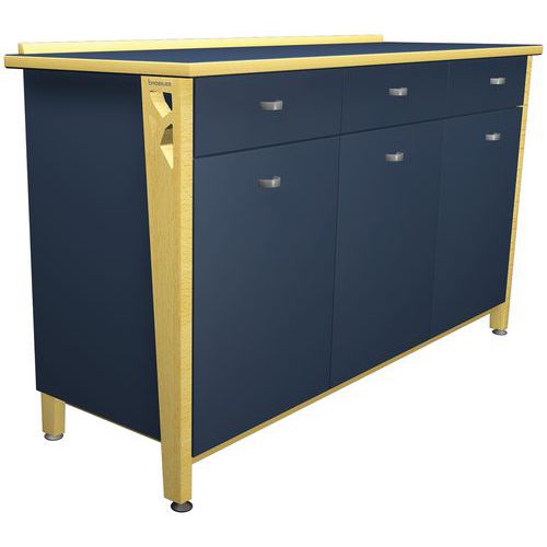 Buffet Iriss avec plateau stratifié de 25 mm, chant PVC de 2 mm. Piètement hêtre massif épaisseur 27 mm, verni naturel, verins plastique. Assemblage vis et tourillons Tiroir et charnière avec frein intégré. Poignées métal, 1 étagère Livré monté. Poids : 102 kg