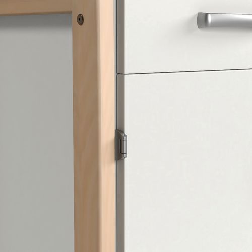 Buffet Swing avec structure et piètement en hêtre massif. Corps, façade tiroirs et portes mélaminé ép.19 mm. Ouverture des portes à 180°. Dessus stratifié ép.24 mm. Chant ABS contretypé, plaqués à chaud. Poignées alu. Amortisseurs sur portes et tiroirs. Vérins réglables en hauteur.