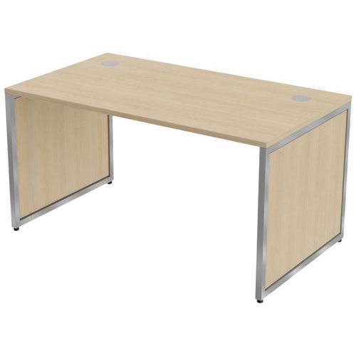 Plateau haute densité finition mélaminé classé au feu M3. Chant plaqué épaisseur 2 mm. 2 obturateurs pour le passage des câbles Ø 80 mm. 2 traverses métalliques pour assurer l’équerrage et la stabilité du plateau 2 pieds cadre en tube acier 30x30 mm équipés de vérins de réglage avec un remplissage panneau mélaminé