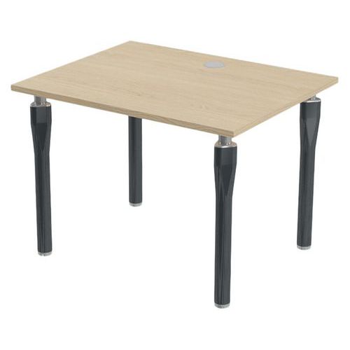 Plateau haute densité finition mélaminé classé au feu M3. Chant plaqué épaisseur 2 mm. 2 obturateurs pour le passage des câbles Ø 80 mm. 2 raidisseurs métalliques sous plateau à partir de 140 cm de large. Pieds en tube acier Ø 60 mm équipés de vérins de réglage. Proposée dans de nombreux format de plateau