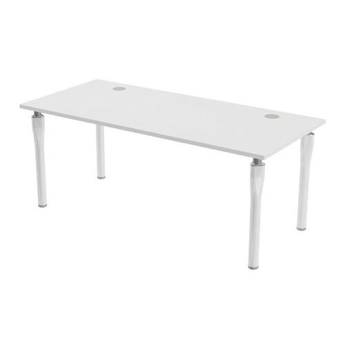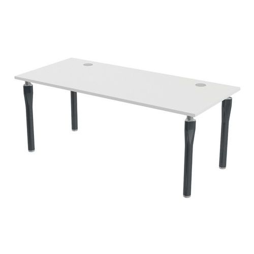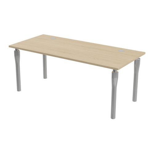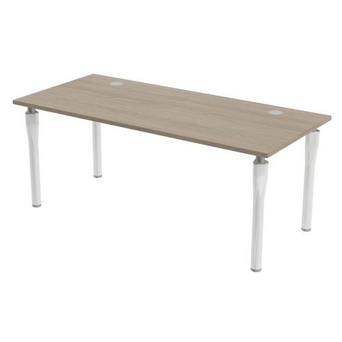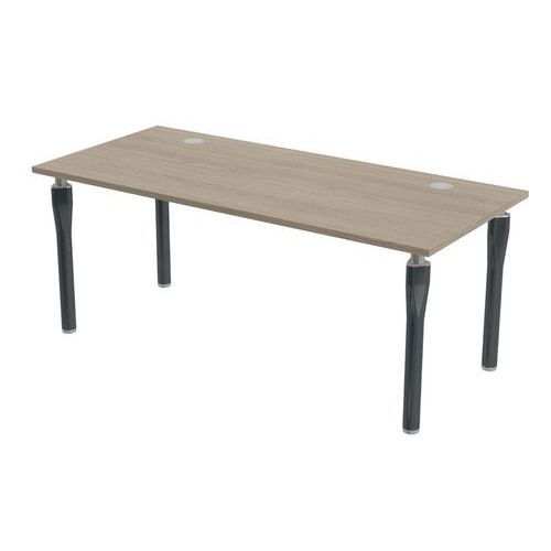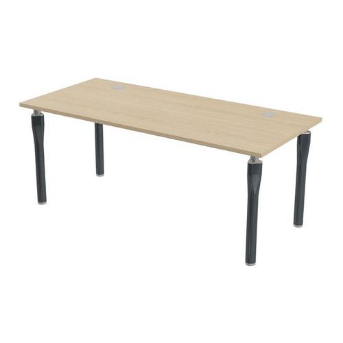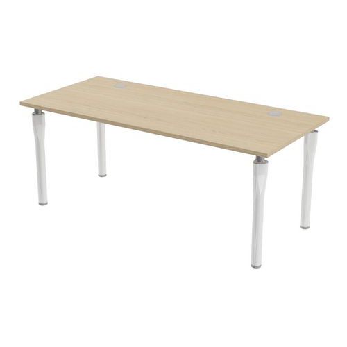 Plateau haute densité finition mélaminé classé au feu M3. Chant plaqué épaisseur 2 mm. 2 obturateurs pour le passage des câbles Ø 80 mm. 2 raidisseurs métalliques sous plateau à partir de 140 cm de large. Pieds en tube acier Ø 60 mm équipés de vérins de réglage. Proposée dans de nombreux format de plateau