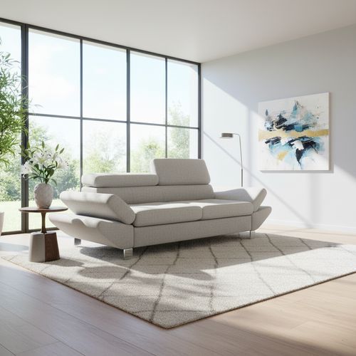 Canapé Vérona avec têtières et accoudoirs réglables pour plus de confort. Assemblage par collage et agrafage. Structure en panneau de particules 16 mm et bois massif. Assise avec ressorts ondulés à arc. Au choix, enduit PVC non classé feu, enduit PVC classé non feu EN 1021-1 et 2 (cigarette et allumette) ou tissu polyester aspect chiné non classé au feu. Structure : Garnissage par mousse polyéther 21 kg/m3. Assise : Mousse polyuréthanne 25 kg/m3 + ouate polyester 150 g/m². Dos : Toile polypropylène. Mousse polyuréthanne 18 kg/m3 + ouate polyester 150 g/m². Coussins fixes pour assise et dos. Pieds métal chromé : hauteur 8 cm.