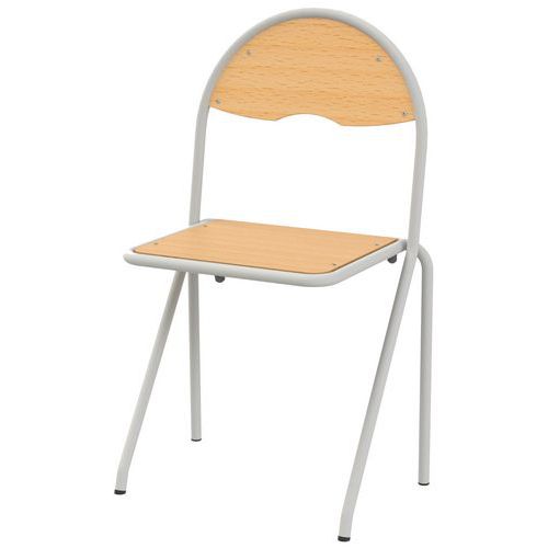 Chaise 4 pieds appui sur table T1 à T6 empilable. Structure : traverses de renfort sous assise. Tube acier rond Ø 25x2 mm. Soudures renforcées avec apport de métal. Assise et dossier : encastrés, fixés sur un tube acier de Ø 25x2 mm Embouts polyamide anti-tâches et insonores. Embouts sous assise pour protéger le plateau en position appui sur table. Plaques de hêtre multiplis croisées et collées sous haute pression à chaud, finition stratifié. Fixation à la structure par rivets aluminium têtes rondes. Conforme aux normes 1729-1 et 1729-2 / NFD 60-050. Livré monté