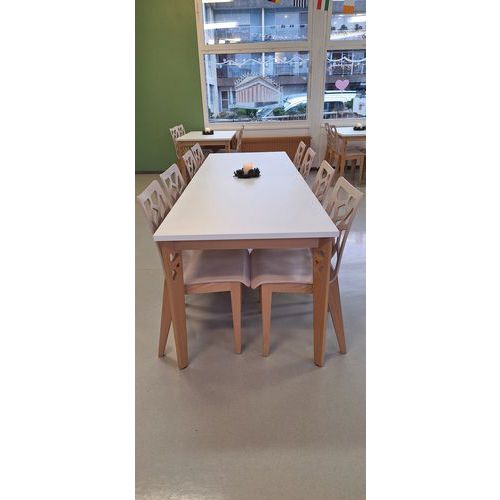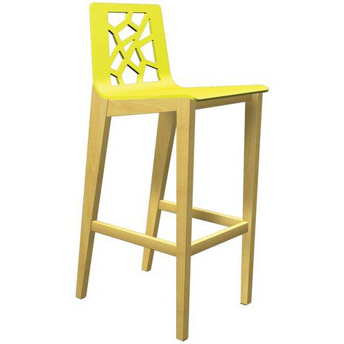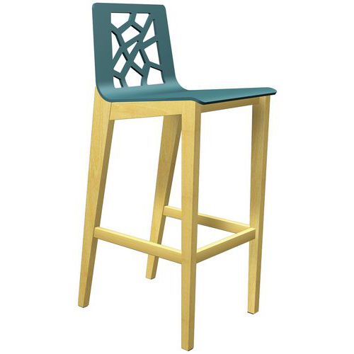 Chaise haute Iriss avec coque en contreplaqué moulé épaisseur 10 mm. Piètement en hêtre massif, épaisseur 27 mm, verni naturel. Assemblage tenons mortaises. Patins plastiques