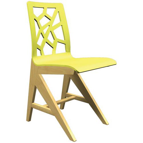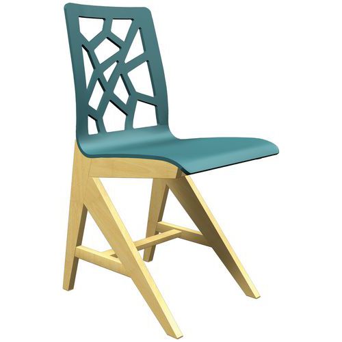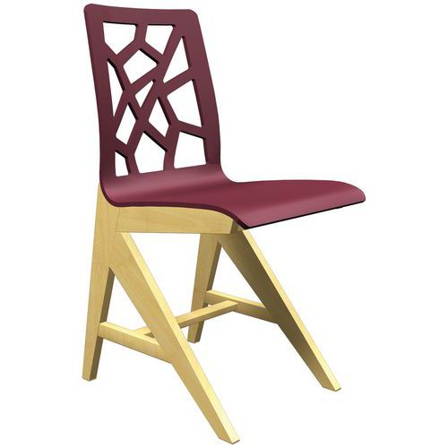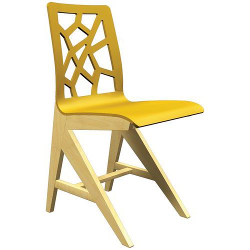 Chaise Iriss avec coque en contreplaqué moulé épaisseur 10 mm. Piètement en hêtre massif, épaisseur 27 mm, verni naturel. Assemblage tenons mortaises. Patins plastiques