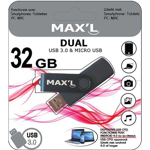 - La Clé Dual USB 3.0 Max’L intègre sur la même Clé USB une connexion USB 3.0 et une connexion Micro USB