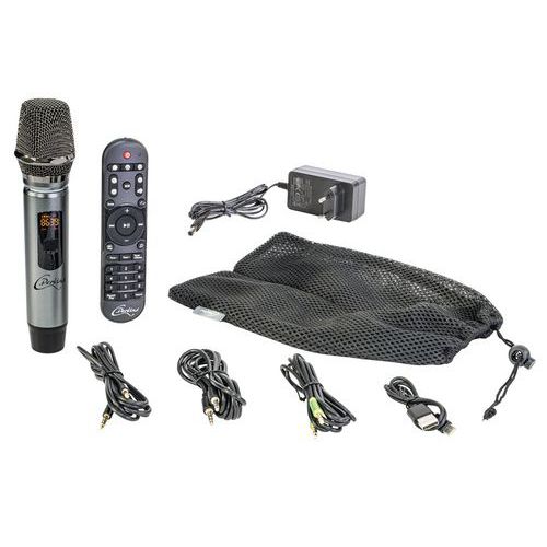 Livré avec : Micro main UHF, cordon de charge USB-C pour charger le micro fourni, adaptateur secteur pour charger la batterie intégrée, housse de rangement/protection pour le micro et la télécommande, 1 câble jack 3.5mm MONO et 2 câbles Jack 3.5m