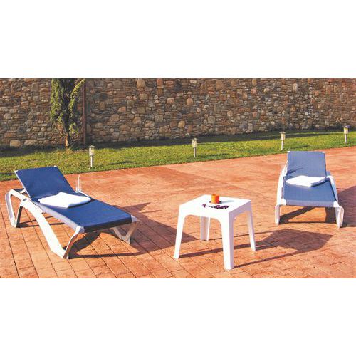 Chaise longue 73 x 190 x 35 cm. Poids 10,6 kg.Table 47 x 47 x 41 cm. Poids 2,14 kg