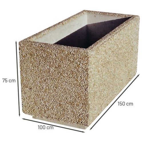 Jardinière béton rectangulaire, finition gravillons lavés. Monobloc, autostable. Trous d'évacuation Ø 40 mm en fond de la jardinière. Fabriquée dans l'Allier. Pour la réception de la jardinière, prévoir un engin de manutention
