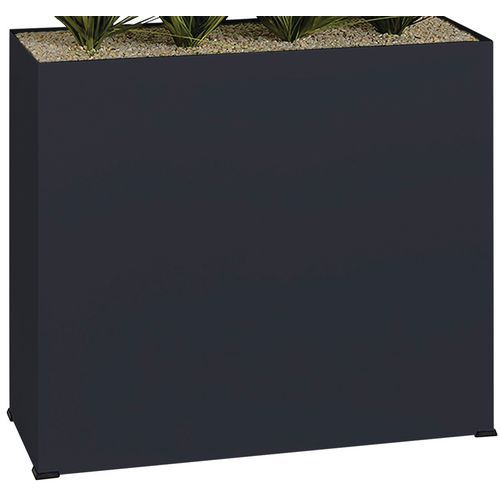 Bac métal épaisseur 1 mm monté sur patins. Plante artificielle de qualité, surfaçage en petits gravillons fixés par résine. Dimensions : 80 x 134 x 25 cm. Poids 24 kg.