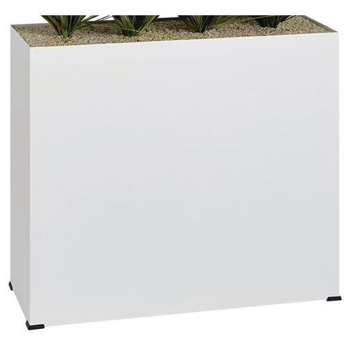 Bac métal épaisseur 1 mm monté sur patins M1 (traité anti-feu). Composition florale artificielle. Surfaçage en petits gravillons fixés par résine. Dimensions totales : 80 x 145 x 25 cm.