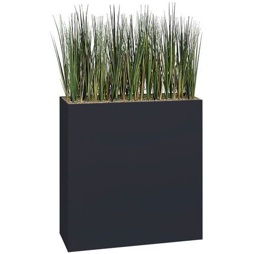 Bac métal hauteur 90 cm, épaisseur 1 mm monté sur patins M1 (traité anti-feu). Plante artificielle de qualité, surfaçage en petits gravillons fixés par résine. Dimensions : 80 x 150 x 25 cm. Poids 24 kg.
