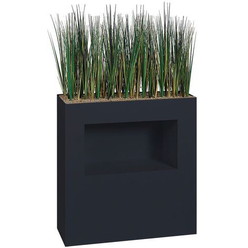 Bac métal épaisseur 1 mm monté sur roulettes. Plante artificielle de qualité, surfaçage en petits gravillons fixés par résine. Dimensions : 80 x 151 x 25 cm. Dimensions de la niche : largeur 57 cm, hauteur 32 cm et profondeur 25 cm. Poids 24 kg.