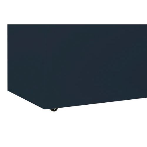 Bac métal épaisseur 1 mm monté sur roulettes. Composition florale artificielle. Surfaçage en petits gravillons fixés par résine. Dimensions totales : 80 x 146 x 25 cm.