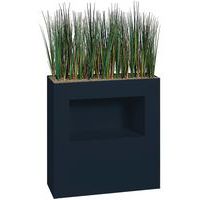 Bac métal épaisseur 1 mm monté sur roulettes M1 (traité anti-feu). Plante artificielle de qualité, surfaçage en petits gravillons fixés par résine. Dimensions : 80 x 151 x 25 cm. Dimensions de la niche : largeur 57 cm, hauteur 32 cm et profondeur 25 cm. Poids 24 kg.