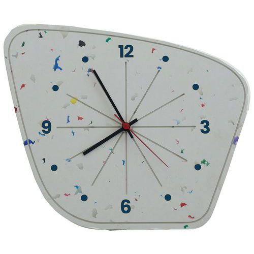 Horloge en matériaux recyclé et upcyclé car fabriquée avec les chutes de plateaux des tables La Mini-Le banc- La carrée etc... En PEHD (polyéthylène haute densité)100% issu de l'économie circulaire blanc moucheté soit décor confettis de style terrazzo. Fabrication française. Horloge éco-conçu et durable Le coloris confettis est obtenu en mélangeant des bouchons de bouteille qui sont broyés et du PEHD recyclé blanc moucheté.