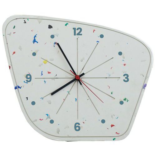 Horloge en matériaux recyclé et upcyclé car fabriquée avec les chutes de plateaux des tables La Mini-Le banc- La carrée etc... En PEHD (polyéthylène haute densité)100% issu de l'économie circulaire blanc moucheté soit décor confettis de style terrazzo. Fabrication française. Horloge éco-conçu et durable Le coloris confettis est obtenu en mélangeant des bouchons de bouteille qui sont broyés et du PEHD recyclé blanc moucheté.
