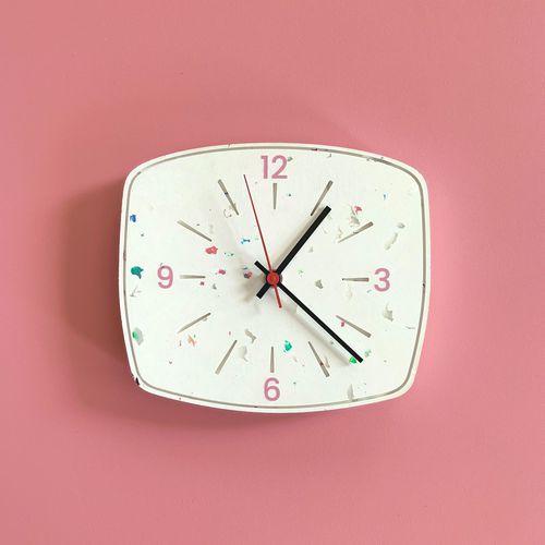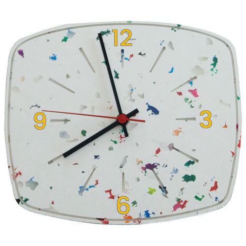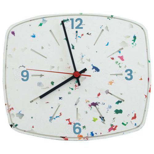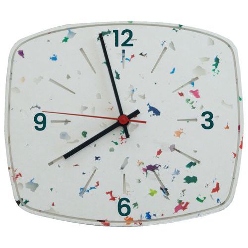 Horloge fabriquée avec les chutes de plateaux des tables La Mini-Le banc- La carrée etc... En PEHD (polyéthylène haute densité)100% issu de l'économie circulaire blanc décor confettis de style terrazzo. Fabrication française. Horloge éco-conçu et durable Le coloris confettis est obtenu en mélangeant des bouchons de bouteille qui sont broyés et du PEHD recyclé blanc moucheté.