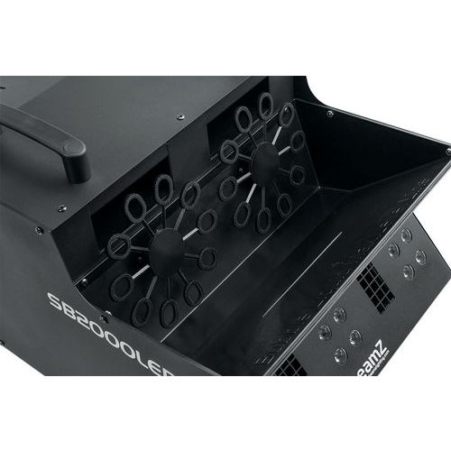 La SB2000LED combine dans un même boîtier, une machine à fumée, une machine à bulles et des LEDs 3-en-1. Le ventilateur de la 2000 crée, chaque minute, une grande quantité de bulles remplies de fumée, générant un effet jet permettant aux bulles de s'envoler. Le système a 18 LEDs de 3 W en rouge, vert et bleu. La SB2000 est facile à remplir, à utiliser et à nettoyer. A la fin du show, vous pourrez très facilement la nettoyer grâce au système de drainage du liquide. Elle possède deux poignées et des roulettes intégrées. Elle accepte tout type de liquide, elle fonctionne au mieux avec le liquide à bulles Beamz (160.575) et le liquide pour machine à fumée Beamz (160.582) pour des animations de très grande qualité.