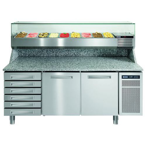 | Intitulé du produit | Meuble de préparation pizza, granit et dosseret,2P+6 tiroirs neutres Afinox, Poids: 230 kg, Hauteur: 103 cm |