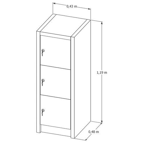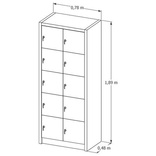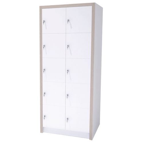 Meuble à cases avec portes idéal pour ordonner ses équipements au sein d'un lieu commun. Meuble livré monté sur socle réglable en hauteur. Réalisé en aggloméré mélaminé de 38 et 19 mm d'épaisseur. Chants ABS coloris chêne. Fermeture de la porte amortie, serrure à clé. Fabrication artisanale française.